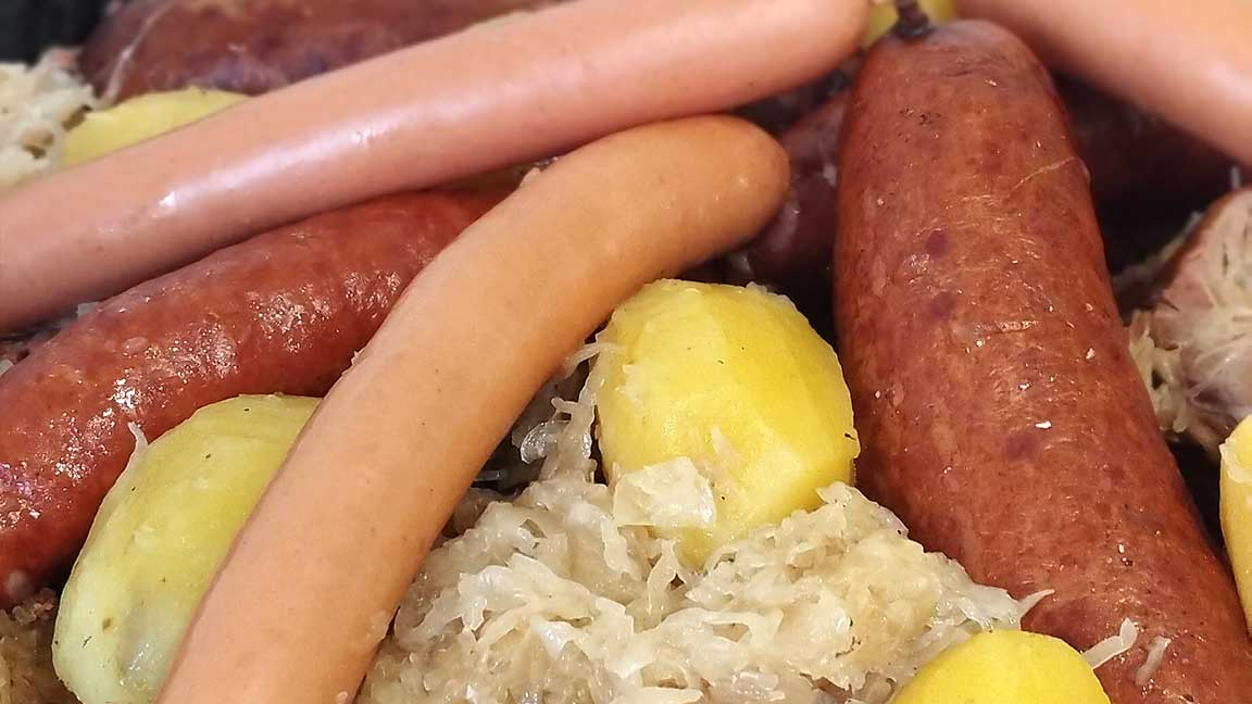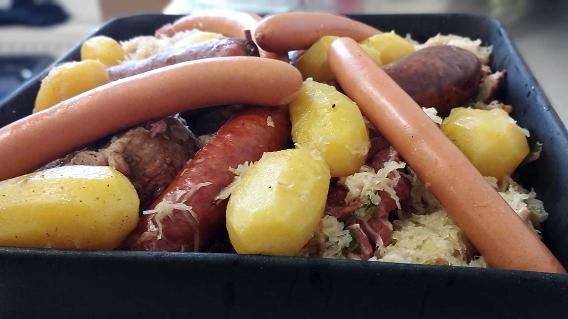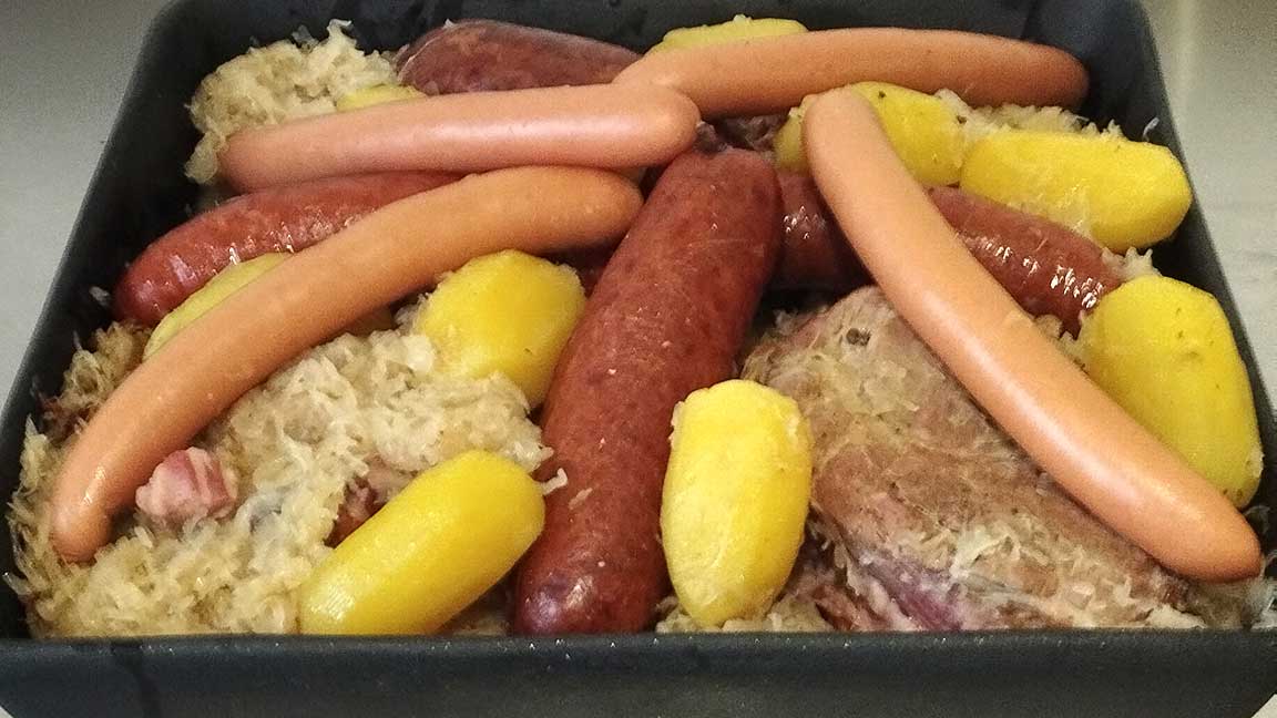 Choucroute alsacienne : chou, épaule de porc, échine, saucisse de Montbéliard, lard, pommes de terre